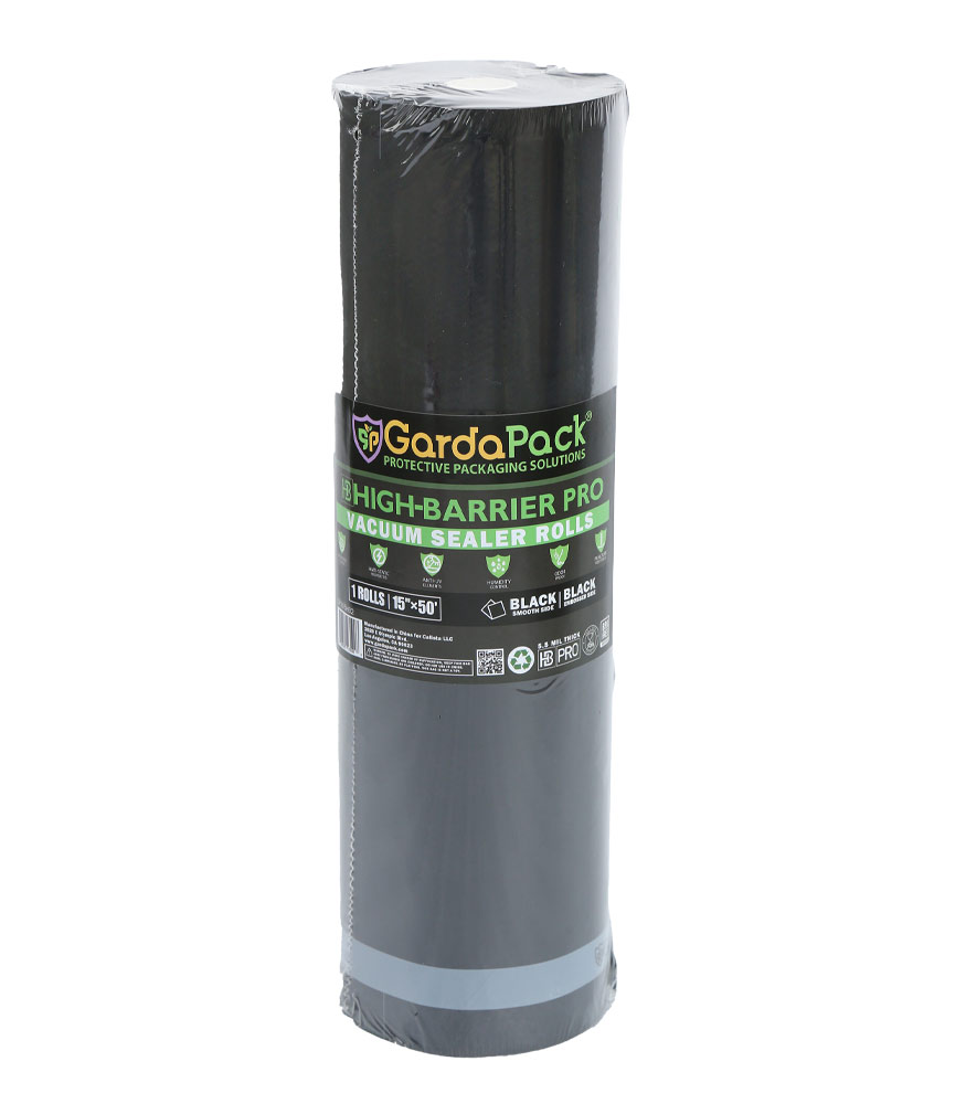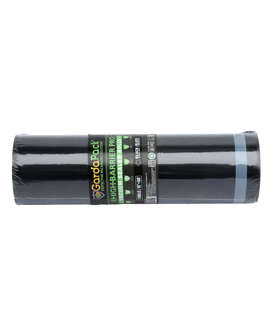 Our GardaPack® High-Barrier Pro 15″x50′ All-Black Vacuum Seal Roll offers the ultimate preservation for your sensitive products. This advanced film is engineered with the lowest OTR and WVTR on the market, combined with Superior Puncture-Resistance, Anti-UV Elements, and Static-Resistance Properties. This ensures even the most sensitive perishables remain as fresh as possible until you’re ready to use them.