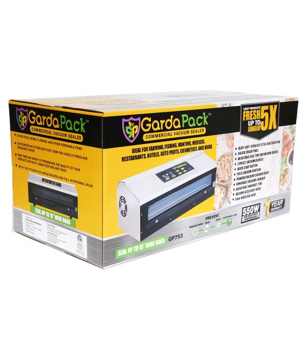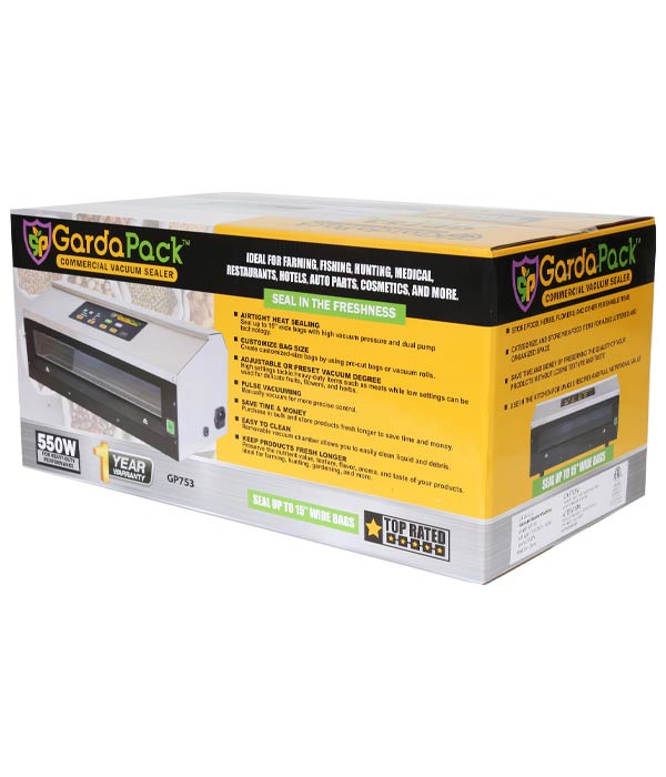 The GardaPack® GP753 Commercial Vacuum Sealer is the ultimate solution for any professional demanding industrial-grade reliability. It is the perfect choice for high-volume applications and specialized preservation needs, including Professional Chefs, Pitmasters, Hunters, Fishermen, and businesses involved in Fish Processing, Meat Processing, and Game Meat Processing. With its heavy-duty construction and robust 550W of power, this machine provides reliable, industrial-grade vacuum sealing capabilities, accommodating bags up to 15″ wide.